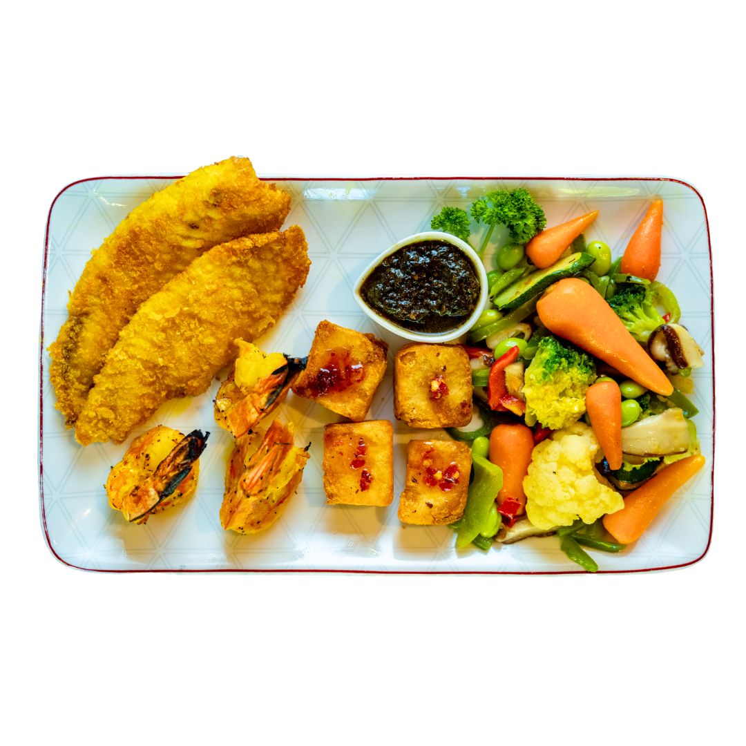A DELIGHTFUL PAIRING OF PRAWNS AND SNAPPER WITH SAUTÉED VEGETABLES AND GHALIEH (HERBS AND TAMARIND) SAUCE. THE OCEAN, REBORN IN SAFFRON LIGHT.