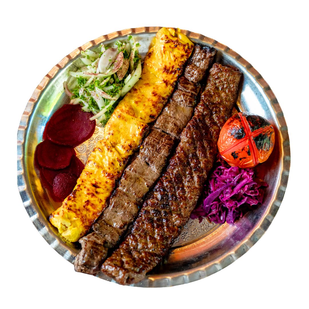 KOOBIDEH AND CHENJEH SERVED TOGETHER. THE HARMONY OF FLAME AND CRAFT.